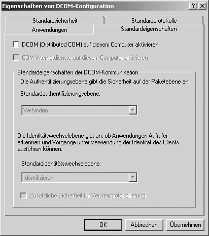 - unter Tabreiter 'Standardeigenschaften' den Haken bei 'DCOM (Distributed COM) auf diesem Computer aktivieren' entfernen