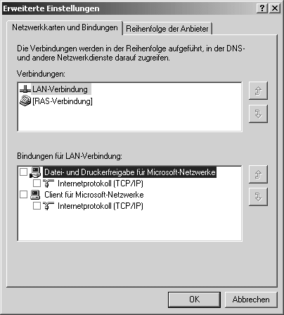 - die Haken bei allen Bindungen in 'Bindungen für LAN-Verbindungen' entfernen