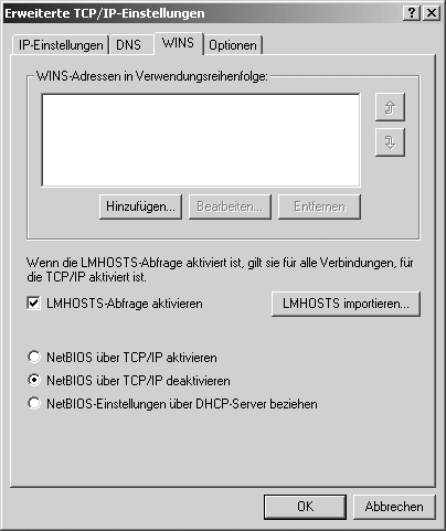 - unter Tabreiter 'WINS', "Netbios über TCP/IP deaktivieren" auswählen