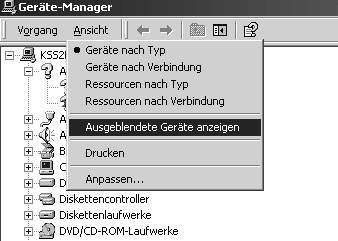 - Im Menü unter 'Ansicht' den Punkt 'Ausgeblendeten Geräte anzeigen' auswählen
