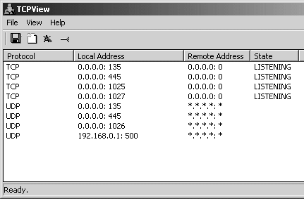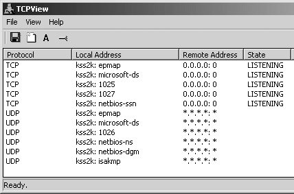 Wie die Ausgabe von TCPView zeigt, sind bei einer Standardinstallation von Windows2000 Professional einige Ports